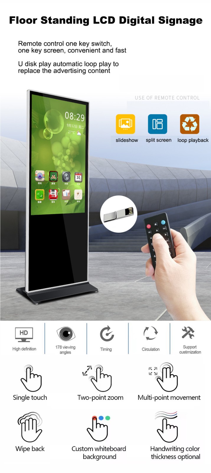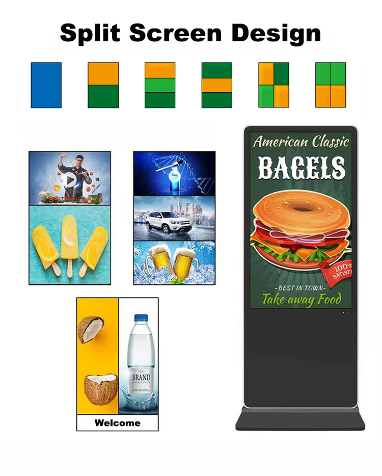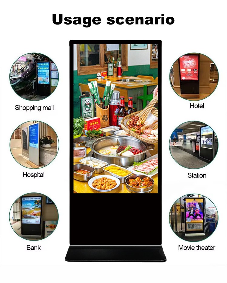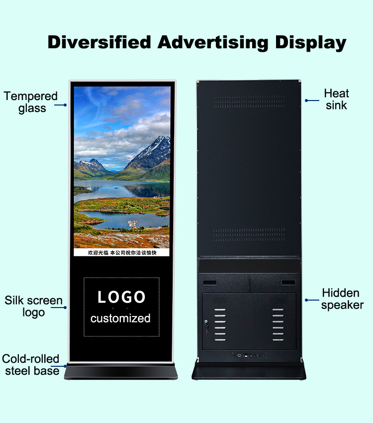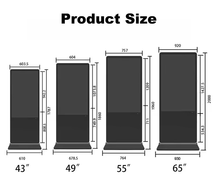 55″ Floor standing digital signage kiosk outside touch screen poster advertising display, RK3568 quad core processor, RAM 2G + ROM 32G , Android 11.0, 55 inch 1920*1080P, support wifi, bluetooth, Ethernet.